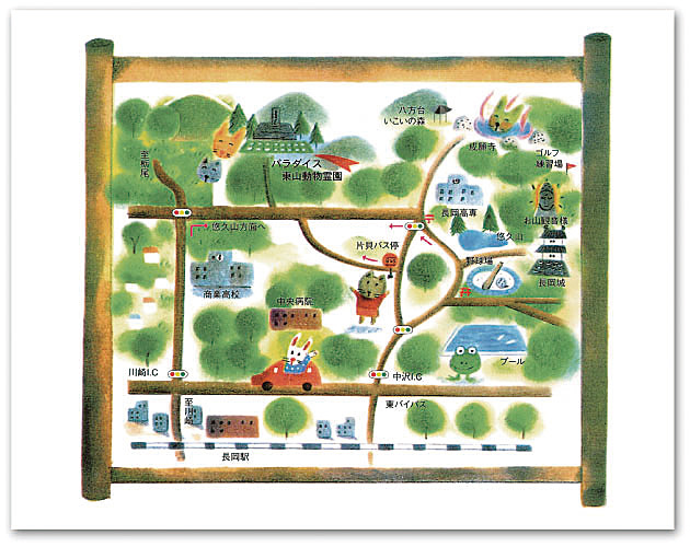 長岡大橋を渡り、まっすぐ川崎のコメリ、パルス方面へ向かってください。バイパスの下を通り過ぎ右手の長岡商業高校を過ぎます。一つ目の信号、悠久山公園方面へ右折してください。道なりに進んだ先に東山動物霊園の看板が見えてきます。